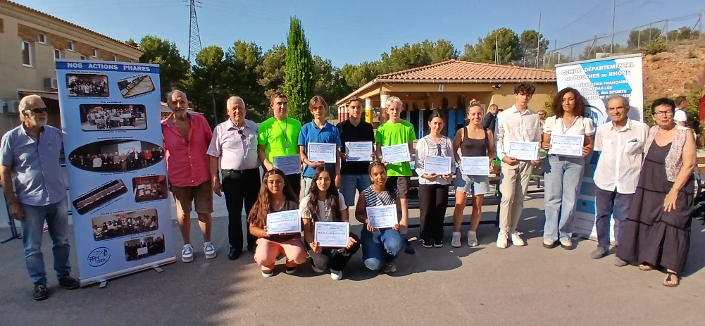 PRIX de la SPORTIVITÉ 2025 du CD13 de la FFMJSEA Mardi 17 juin 2025 au "Collège Sainte Elizabeth à La Gavotte" Cette cérémonie répond aux actions souhaitées par notre Fédération, parmi lesquelles l’on trouve l’hommage et la reconnaissance des citoyens. Les distinctions que nous avons remises ont pour but de faire connaître à certains élèves des classes de 3ème, l’importance des valeurs associées à l’éducation physique et sportive, à parité avec le travail scolaire. L’attribution de ces prix correspond à 3 critères : La valeur scolaire : ou, nous avons apprécié les résultats scolaires obtenus pendant la classe de 3ème, en soulignant, la motivation, le sérieux, et en prenant en considération les progrès de l’élève. La valeur sportive : en tenant compte des résultats sportifs, du niveau de pratique, et la participation à une activité physique dans une Association à l’intérieur ou à l’extérieur de l’établissement fréquenté. La valeur morale : nous nous sommes attachés à dégager les qualités de l’élève dans le domaine de l’initiative, du goût à entreprendre, de la ténacité, du sens de l’équipe, et du Fair Play. La Commission de délibération, réunie le jeudi 5 juin 2025 au siège de notre Comité a étudié, après un travail de préparation effectué par Jacques Nicolaï, les 21 dossiers qui nous ont été présentés (13 filles et 8 garçons), pour ne retenir que 7 Lauréats filles et 7 Lauréats garçons suivant : 1- CEPOLLINA Laëticia – Collège Sainte Elisabeth des Pennes Mirabeau 2- CUNY Marion – Collège Alphonse Daudet d’Istres 3- HAMISSI Sana – Collège Carraire de Miramas 4- HEIDENGER Elisa - Collège Carraire de Miramas 5- LABOULAIS Louna - Collège Carraire de Miramas 6- LAO Louna – Collège Les Hauts de l’Arc à Trets 7- NEDJAR Shaïma – Collège Thiers à Marseille 1- BADIN Titouan – Collège Charles Rieu à Saint Martin de Crau 2- EL BOUARFAOUI Liham - Collège Les Hauts de l’Arc à Trets 3- KRAUSS Mathias – Collège Provence à Marseille 4- LAUTREY-RAYER Camille – Collège Pesquier à Gardanne 5- NEGRE Liam - Collège Sainte Elisabeth des Pennes Mirabeau 6- SALVATORINI Gaëtan – Collège Robespierre à Port Saint Louis du Rhône 7- ZUSATZ Benjamin - Collège Les Hauts de l’Arc à Trets § Nous remercions tous nos partenaires et en particulier le Conseil Départemental des Bouches du Rhône, sa Présidente Martine Vassal et son délégué aux sports Thierry Santelli pour la dotation offerte aux 14 élèves, sans oublier bien sûr, la Principale du Collège Sainte Elisabeth, Madame Nathalie LEBOEUF. Notre Comité Départemental 13 était représenté par : Jacques et Michèle Nicolaï, Jean Pierre Lelard, Michel Schmieder, Philippe Morand et Lisbeth et Jacques Bonnet Jacques Bonnet Président du CD13 FFMJSEA |